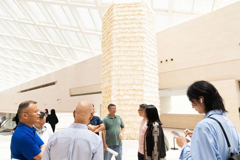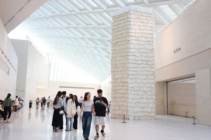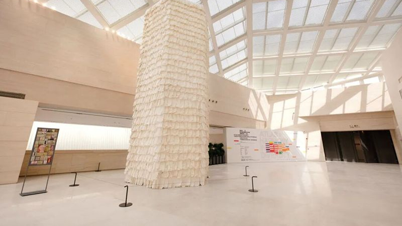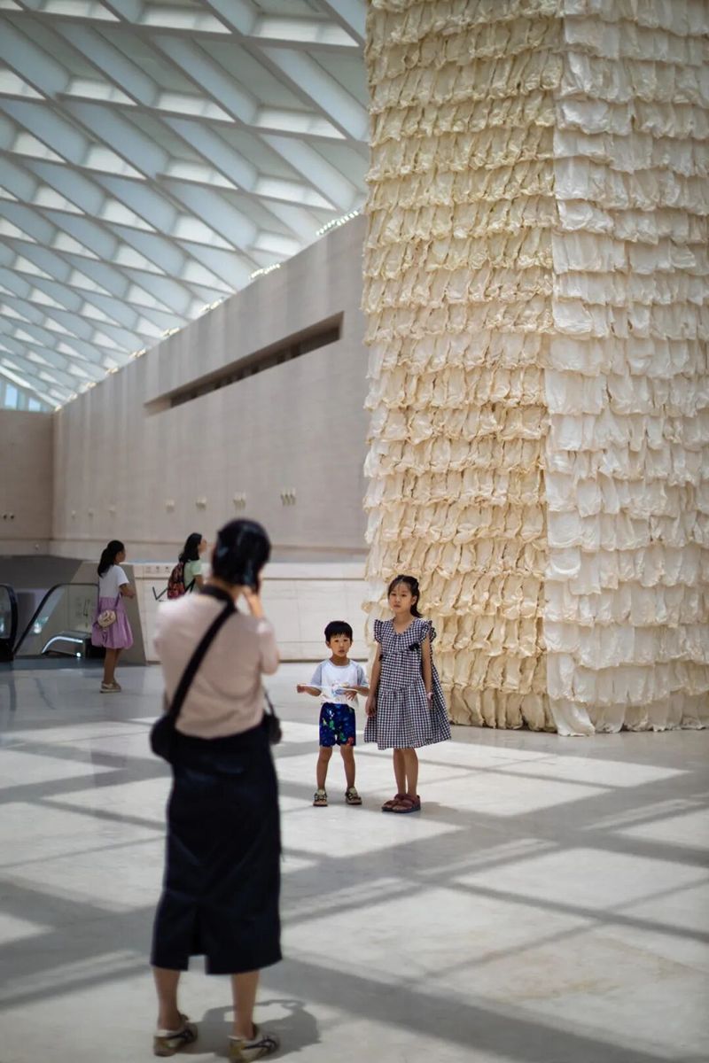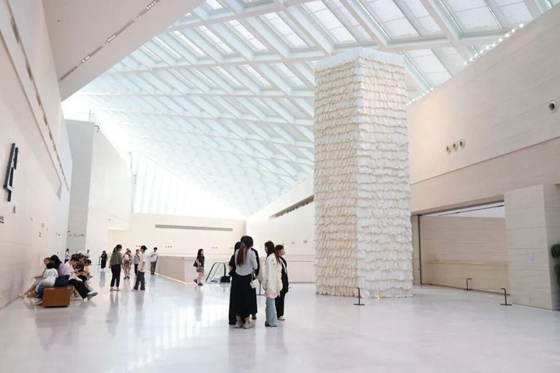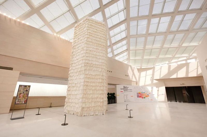 Rice Paper Pagoda is composed of thousands of sheets of rice paper, cotton threads, bamboo poles, and other environmentally friendly materials, forming a large indoor tower-like installation adorned with built-in lighting. The inspiration for this work comes from the architectural imagery of pagodas in Chinese painting. As a structure that embodies spirituality, the pagoda integrates multiple cultural symbols. Zhu Jinshi's work employs an abstract depiction of the tower, echoing not only Chinese pagodas but also reflecting the image of towers from various countries in a cross-cultural and cross-historical context.